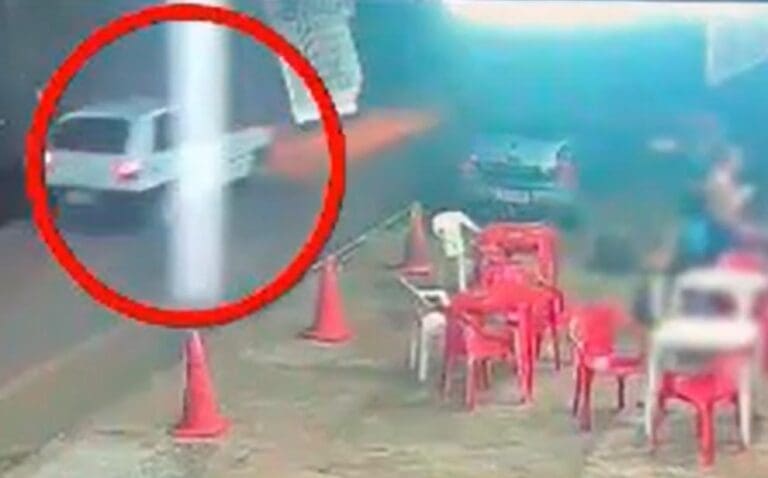 As imagens são de um comércio próximo a PEL II (Penitenciária Estadual de Londrina). No veículo branco, estavam a mãe e o padrasto. Na primeira imagem, o carro segue tranquilamente no sentido centro.