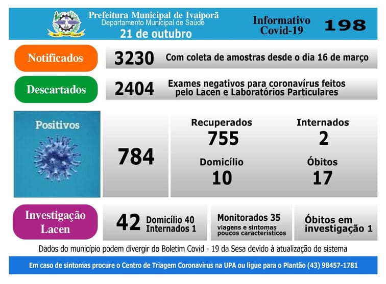 O Departamento Municipal de Saúde e a Vigilância Epidemiológica de Ivaiporã confirmaram nesta sexta-feira (2), mais 70 casos de Covid-19 . Trata-se de 69 resultados liberados pelo Lacen (PCR) e um por laboratório particular, que analisa PCR e teste rápido.