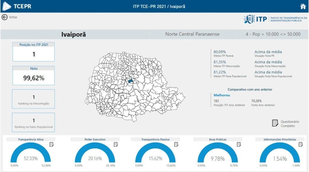 A administração pública de Ivaiporã inicia 2022 com uma excelente notícia. Foi a 1ª colocada entre os 399 municípios do Paraná no Índice de Transparência da Administração Pública (ITP) elaborado pelo Tribunal de Contas do Estado (TCE-PR), que divulgou os resultados nesta quarta-feira, dia 2 de fevereiro.