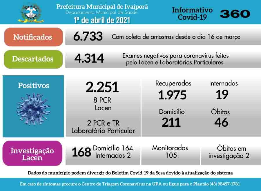 Com os novos casos confirmados, 2251 moradores de Ivaiporã testaram positivo para a Covid-19 desde o início da pandemia, dos quais 1975 estão recuperados e iberados do isolamento.