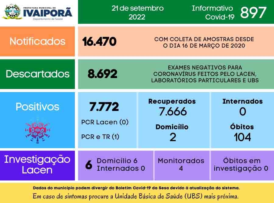 Desde o inicio da pandemia, Ivaiporã soma 7.772 pessoas infectadas com a doença, dessas 7.666 curadas.