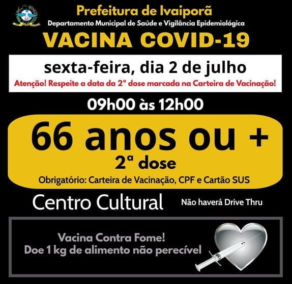 Nesta sexta-feira (2) a vacinação contra a Covid-19 segue em Ivaiporã. A imunização será no Centro Cultural, que fica localizado na Av. Brasil, ao lado da Sanepar.
