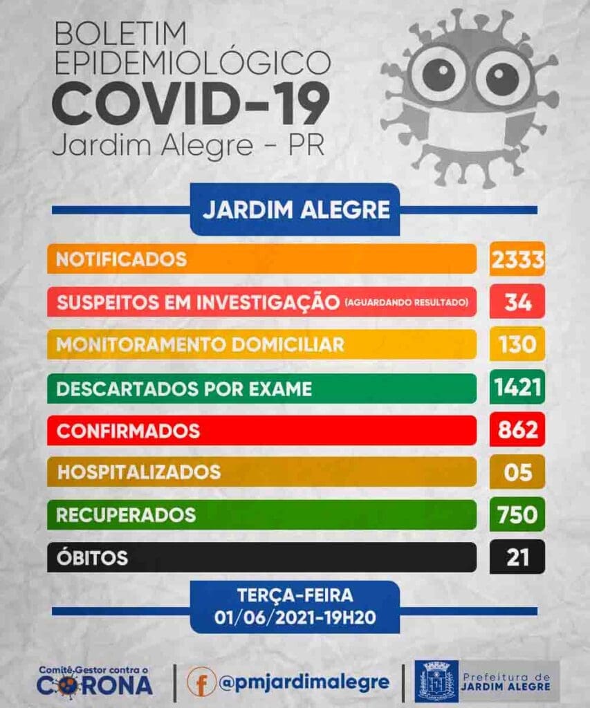 Jardim Alegre soma desde o início da pandemia 862 pacientes infectados com o vírus. Desses, 750 se recuperaram da doença e 21 óbitos por Covid-19.