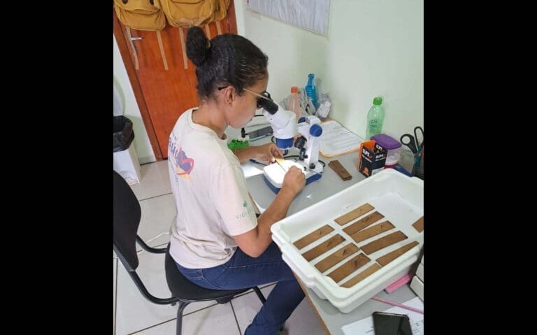 O microscópio é utilizado pela equipe para fazer a leitura das palhetas das ovitrampras, que são armadilhas instaladas em diferentes pontos da cidade. Os dispositivos simulam o ambiente perfeito para a procriação do Aedes aegypti: um vaso de planta preto é preenchido com água. Nele, é inserida uma palheta de madeira que facilita que a fêmea do Aedes coloque ovos.