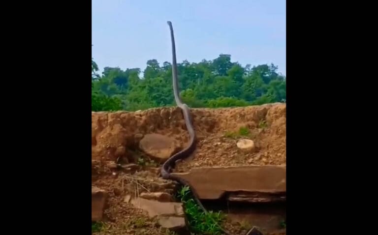 O agente florestal indiano, Susanta Nanda, publicou um vídeo que viralizou e assustou grande parte dos internautas. No registro, uma cobra-real, a serpente venenosa mais comprida do mundo, aparece no topo de uma encosta “em pé”.