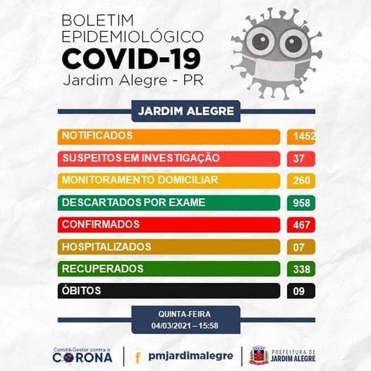 Com mais 11 casos confirmados da Covid-19, em Jardim Alegre, acrescentados nas últimas 24 horas, o número total de pessoas infectadas pelo novo coronavírus chegou a 467. Esses dados foram divulgados pela Secretária Municipal de Saúde.