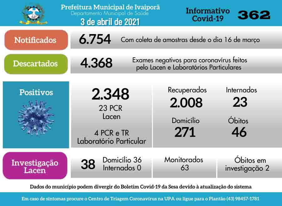 Segundo o Departamento Municipal de Saúde e a Vigilância Epidemiológica entre os 23 exames de PCR, 14 resultados positivos são exames de detentos da carceragem da 54ª Delegacia de Polícia Civil de Ivaiporã, que soma 81 casos de Covid-19 com coletas feitas nos dias 25, 30 e 31 de março.