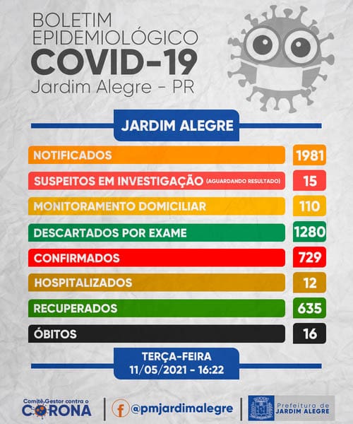O novo boletim publicado nas redes sociais da Prefeitura de Jardim Alegre, nesta terça-feira (11), mostra que mais três casos da Covid-19 foram confirmados no município.