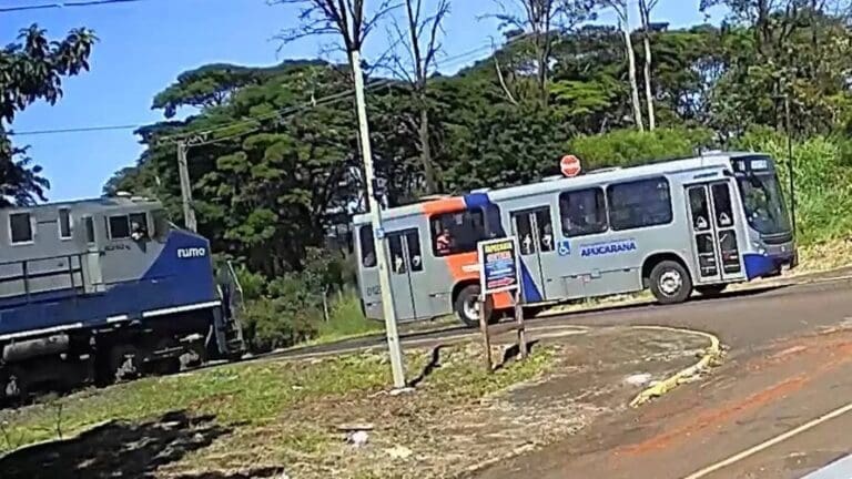 Por pouco, uma tragédia não foi registrada na manhã deste sábado (22) em Apucarana, norte do Paraná. Um motorista da Viação Apucarana Ltda (VAL) cruzou a linha férrea poucos segundos antes de uma locomotiva passar, colocando em risco os passageiros.