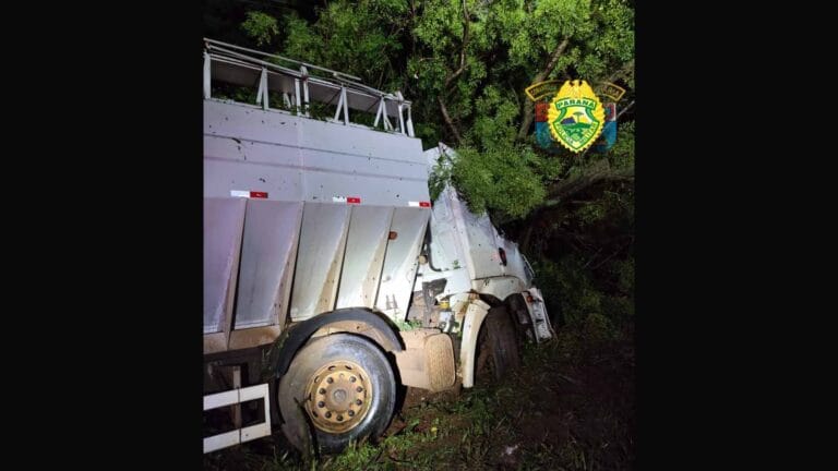 Um caminhão VW 30.330, com placas de Apucarana/PR, colidiu contra árvores margens da PR-170, em Rolândia, na quinta-feira (7).