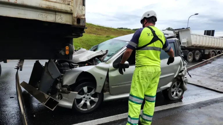 O homem estava em um Peugeot 206, que foi empurrado por uma carreta e ficou parcialmente destruído. Ele ficou preso às ferragens pelas pernas, mas teve apenas ferimentos leves. Foi socorrido pela equipe da Arteris Litoral Sul e levado a uma Unidade de Pronto Atendimento (UPA).