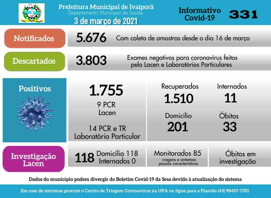 Com os novos casos confirmados Ivaiporã soma 1755 diagnósticos positivos desde o início da pandemia, 1510 recuperados e 33 óbitos.