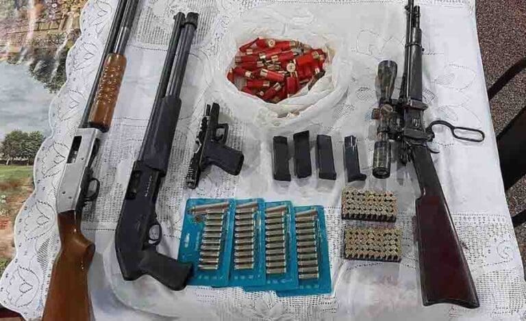 Com isso os policiais se deslocaram ao endereço e localizaram os suspeitos. Foram encontrados com os abordados, duas espingardas calibre 12, carabina Winchester calibre 357, com luneta e cano roscado para adaptação de supressor de ruídos (silenciador), uma pistola calibre 380, bem como diversas munições e cartuchos.