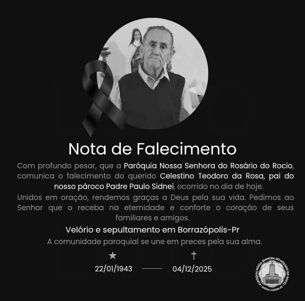 Celestino Teodoro da Rosa, ex-morador do Bairro Água da Onça, em Borrazópolis, morreu nesta quinta-feira (4). Ele morava atualmente em Jardim Alegre e era pai do padre Paulo Sidnei, pároco da Paróquia Nossa Senhora do Rosário do Rocio, também natural de Borrazópolis.