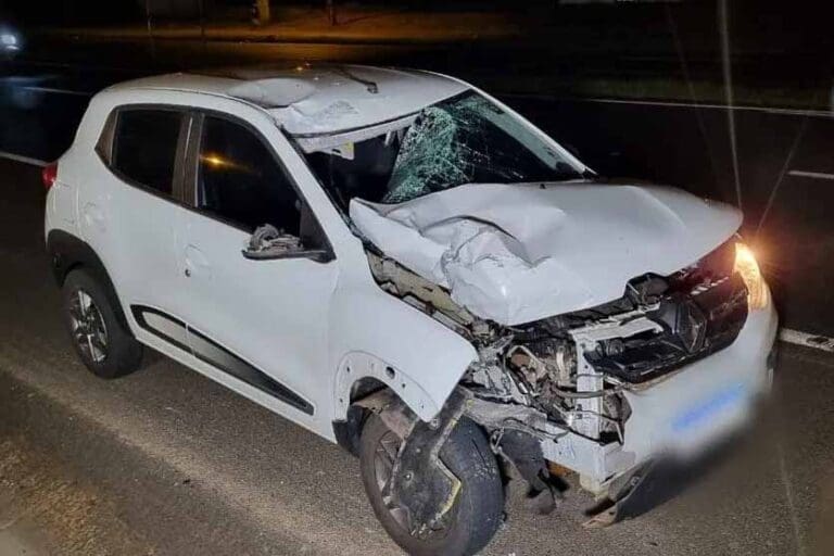 A frente do veículo ficou destruída, onde pode ser constatada a gravidade do acidente. O motorista do carro Renault Kwid não teve ferimentos.