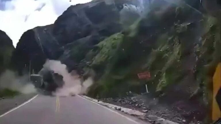 Como é possível ver no registro, feito por uma câmera instalada em um dos veículos que transitava na pista, há um caminhão trefegando no local. Pouco tempo depois, uma rocha desliza sobre a montanha e o atinge em cheio.