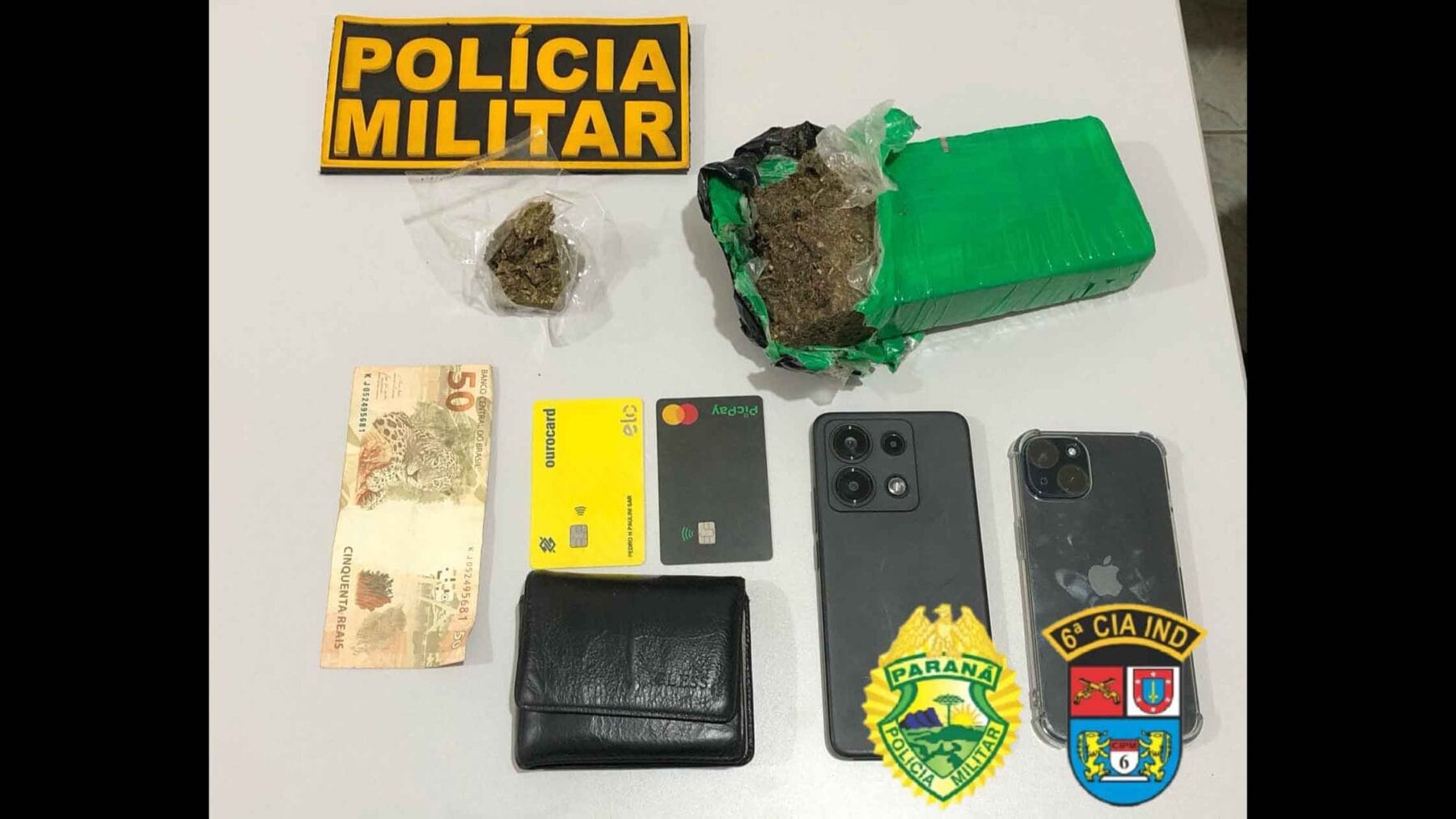 No local, encontraram um tablete de maconha com 480 gramas. O homem recebeu voz de prisão e foi levado para a sede da 6ª Companhia Independente da Polícia Militar.