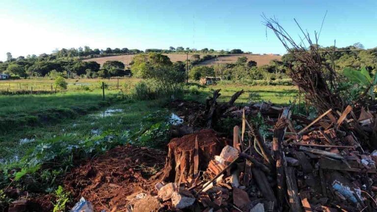 No local em contato com os fiscais, eles relataram que receberam várias denúncias de populares, que haveria uma máquina retroescavadeira, a mando do proprietário do terreno, aterrando resíduos de podas de árvores e entulhos de construção em área de preservação permanente “córrego e banhado”.