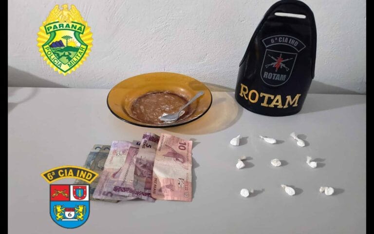 Além dos entorpecentes, os militares apreenderam R$ 29,00 em cédulas trocadas, um prato com resquícios de cocaína, utilizado no preparo das porções e celulares.