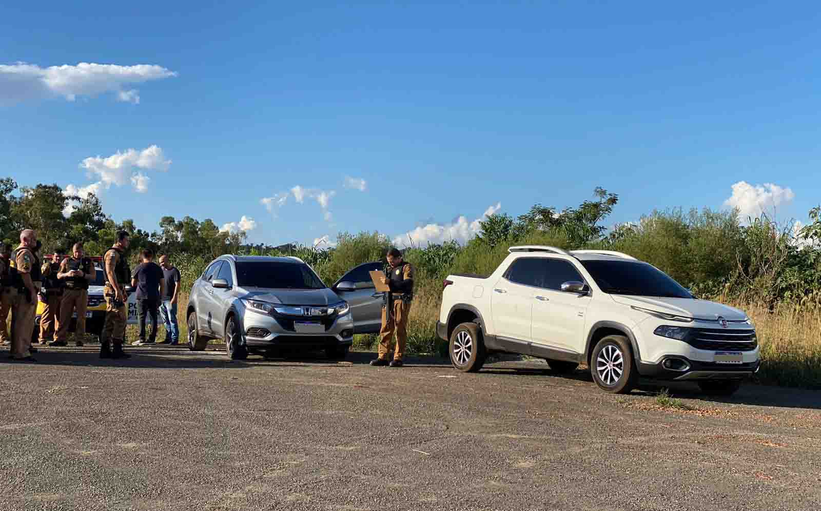 Diante dos fatos, foi solicitado apoio e após buscas na região, as equipes lograram êxito em encontrar e recuperar uma caminhonete Fiat/Toro branca com alerta de Furto/Roubo no Município de Eldorado/SP em janeiro de 2023, uma caminhonete Ford/Ranger prata sem placas com alerta de Furto/Roubo no Município de Juranda/Pr em dezembro de 2022 e um Honda/HRV prata com alerta de Roubo no Município de São Miguel do Iguaçu em junho de 2022.