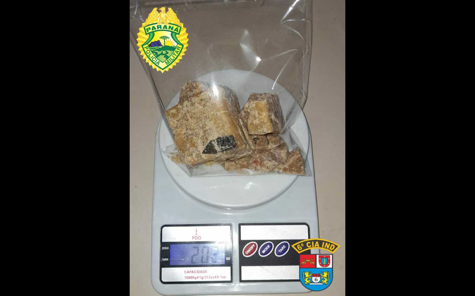 A primeira situação foi às 10 horas na Vila Monte Castelo, após abordagem de um indivíduo que saiu de um táxi com uma mochila na costa. Em revista pessoal foi encontrado na cintura uma sacola com uma pedra grande e várias pedras menores que pesadas posteriormente totalizou 202 gramas, autor relatou a equipe que reside em londrina e por dever aos traficantes foi a cidade trazer a e pagar sua dívida.