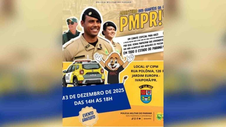 A ação será na 6ª CIPM, na Rua Polônia, 120, no Jardim Europa, das 14 às 18h. A PM convida moradores de Ivaiporã e região para visitar o quartel e participar da programação.