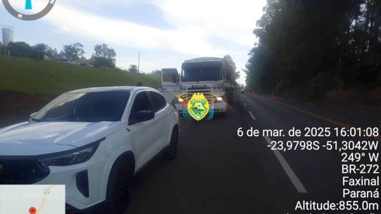 Um Fiat Fastback colidiu com um pneu estepe que se desprendeu de um caminhão na PR-272, na altura do Km 219, em Faxinal, na tarde de quinta-feira (6), por volta das 16 horas. Apesar do susto, ninguém se feriu.