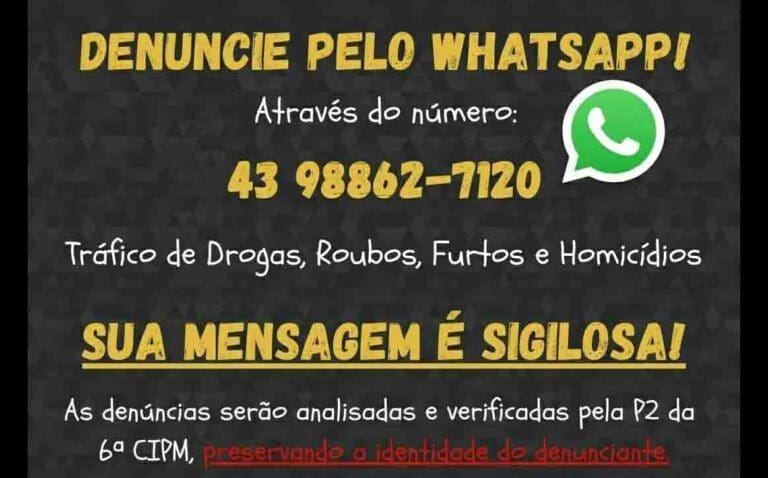 O número de contato é (43) 98862-7120, e o serviço é exclusivo para denúncias relacionadas a crimes como tráfico de drogas, roubos, furtos, receptação, armas e foragidos.