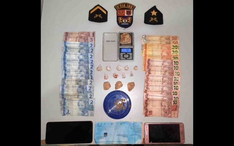 Em busca pessoal foi localizado com um deles cinco pedras de crack que juntas pesavam 0,5 gramas. Ambos disseram ser usuários e que haviam adquirido da casa que haviam saído, sendo então dada voz de prisão.
