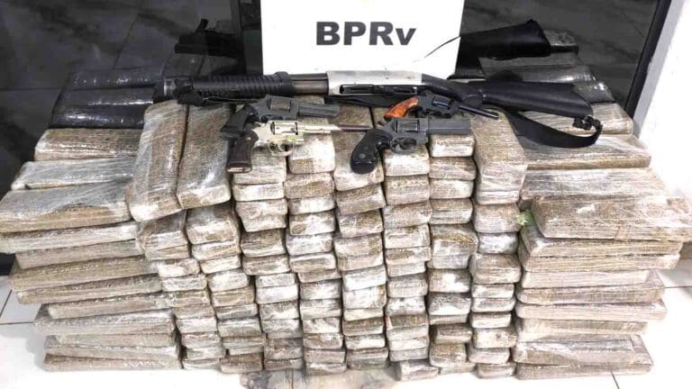 Durante a revista no carro, os policiais encontraram 167 tabletes de maconha, totalizando 143 kg, no porta-malas. Além da droga, o homem transportava uma espingarda calibre 12 e quatro revólveres.