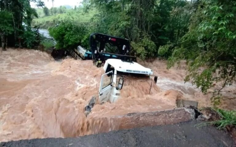 Na terça-feira (11), uma ponte despencou com um caminhão e deixou quatro homens ilhados em Ibicaré, no Oeste catarinense. O veículo foi levado pela forte correnteza. Segundo os bombeiros, que atenderam a ocorrência na região de Linha do Cedro, ninguém ficou ferido.