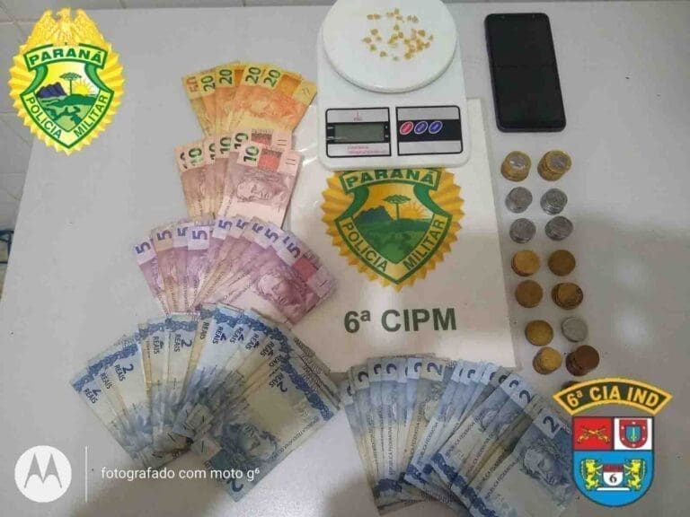 Na residência, foi localizado um recipiente com 31 pedras de crack pesando aproximadamente 3 gramas e R$ 398,10 em dinheiro.