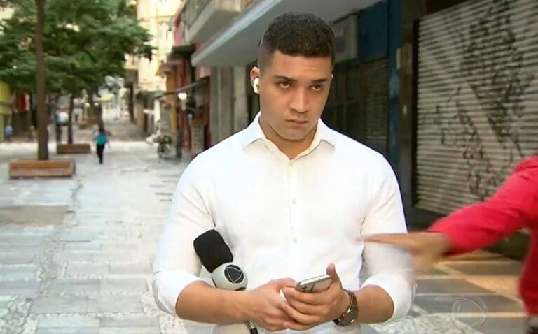 “É a segunda vez que a gente presencia um assalto e agora eu quase fui vítima”, inicia Guimarães ao vivo no telejornal. “A gente estava preparado para fazer uma entrada ao vivo, quando, de repente, passou um rapaz de bicicleta e camisa vermelha. Ele passou uma vez e observou”, disse o repórter.