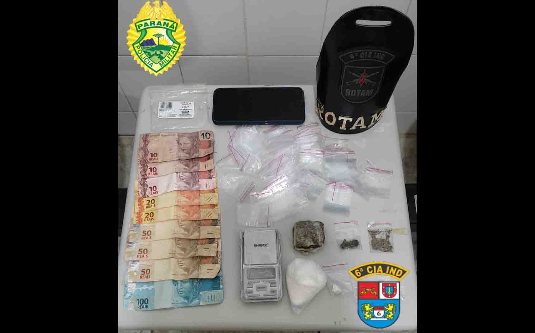 Ação da equipe de ROTAM da 6ª Companhia Independente da Polícia Militar (6ª CIPM) resultou na prisão de um suspeito de tráfico de drogas, na Rua São Sebastião em Ivaiporã. Também foram apreendidos 58,7 gramas de cocaína e 18,8 gramas de maconha. A ação policial, conforme o boletim de ocorrência, foi na noite de sábado (6), por volta das 22h30.