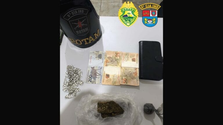 Com a confirmação da denúncia, a equipe entrou na casa e encontrou o suspeito. Durante a busca, os policiais acharam uma porção de maconha de 42,95 gramas escondida sob um armário, além de R$ 300 em cédulas trocadas e uma corrente de prata.