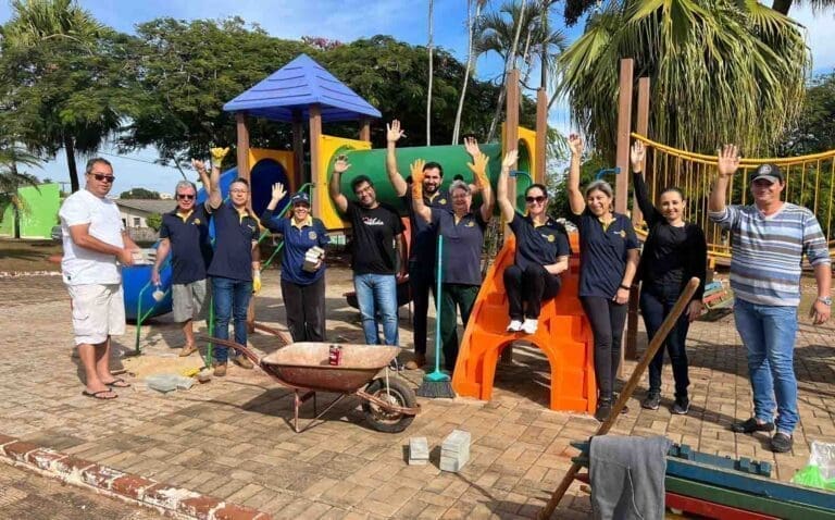 Durante o dia, os rotarianos fizeram a limpeza com thinner nos brinquedos e restauraram a calçada com novos bloquetes. Os brinquedos que foram quebrados foram levados para conserto em uma empresa da cidade.