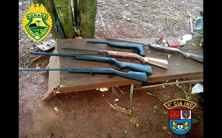 Também foram encontradas três espingardas do tipo caseira “puxa fieira”, duas espingardas de pressão e um bornal, contendo estojos, pólvora, chumbo e espoletas.