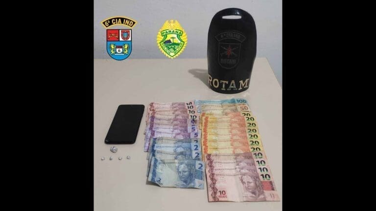 Durante as buscas foi encontrado com o jovem, uma sacola com quatro pedras de crack pesando 300 miligramas e uma pedra maior de 800 miligramas, suficiente para fazer aproximadamente outras 10 pedrinhas. Nos bolsos de sua calça foram localizados R$448,00 em cédulas diversas, característica de dinheiro de tráfico de drogas.