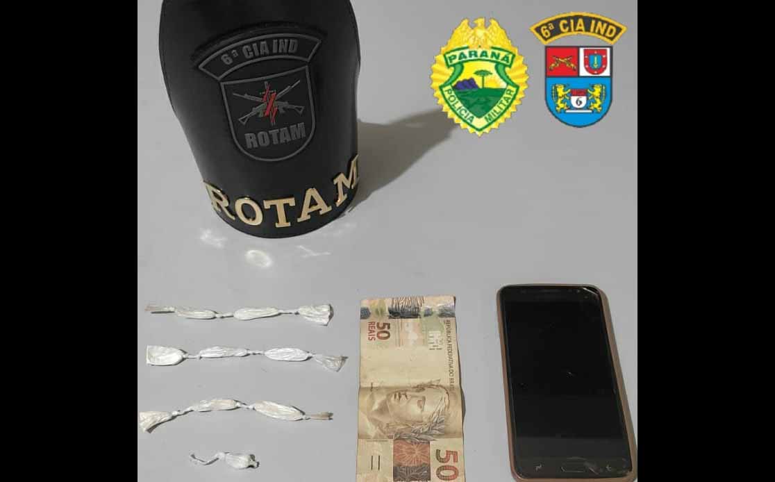 A Polícia Militar (PM) após diligências logrou êxito em prender duas pessoas, uma mulher e um homem, suspeitos de tráfico de drogas, em Faxinal. Foram apreendidos 10 invólucros de cocaína que pesaram quatro gramas, dinheiro, além de outros objetos de procedência duvidosa.