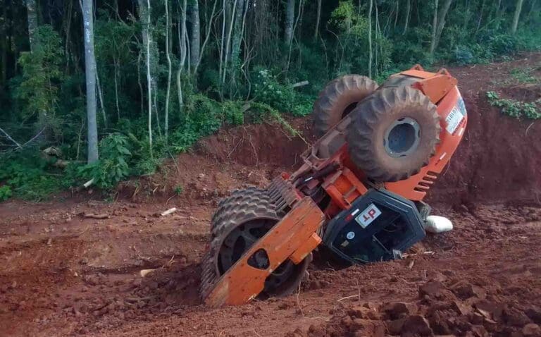 Um acidente com maquinário pesado foi registrado na manhã desta terça-feira (12), nas obras de duplicação da PR-445, em Mauá da Serra. Um rolo compactador caiu de um barranco e acabou capotando. O condutor ficou ferido.