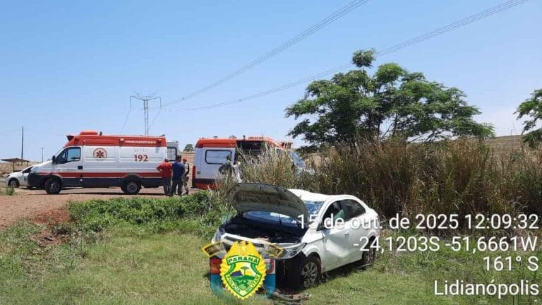 Segundo a Polícia Rodoviária (PRE) do posto Ubá do Sul, o Prisma trafegava sentido Jardim Alegre a Lidianópolis quando a condutora, de 30 anos, perdeu o controle e capotou na margem direita da rodovia.