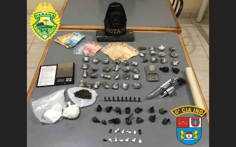 Segundo o boletim de ocorrência das PM, a ação policial ocorreu na Rua Plácido Miranda, em uma residência. Na revista pessoal e no interior da casa, a equipe encontrou uma grande quantidade de drogas, um revólver com munições intactas, dinheiro em espécie e outros objetos de procedência duvidosa.