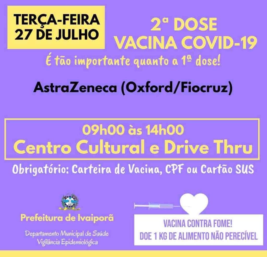 A campanha de imunização contra a Covid-19 da Prefeitura de Ivaiporã segue, nesta terça-feira (27), com a vacinação da segunda dose para  população geral, que receberam a primeira dose com o imunizante Astrazeneca (Oxford/Fiocruz), com agendamento para esta data.