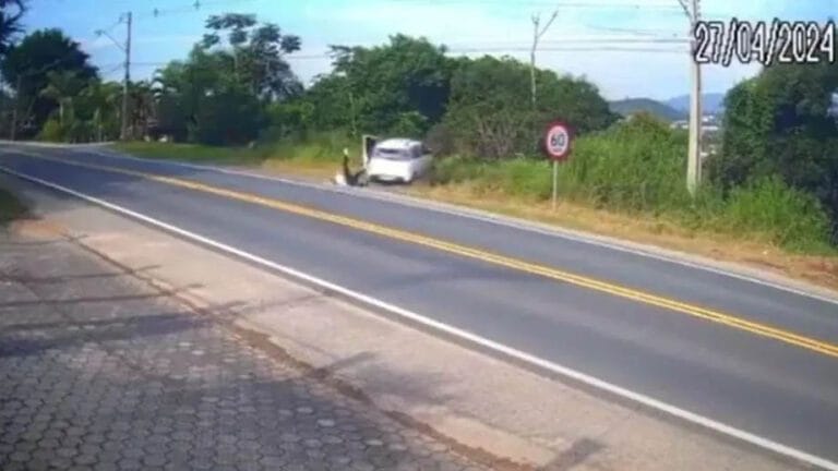 Uma câmera de segurança registrou um caso inusitado de um casal que pulou do carro em movimento e jogou o veículo em uma ribanceira. O fato aconteceu no sábado, 27, na pista da rodovia SC-410, localizada no bairro Rio do Braço, em São João Batista (SC). (veja o vídeo abaixo)