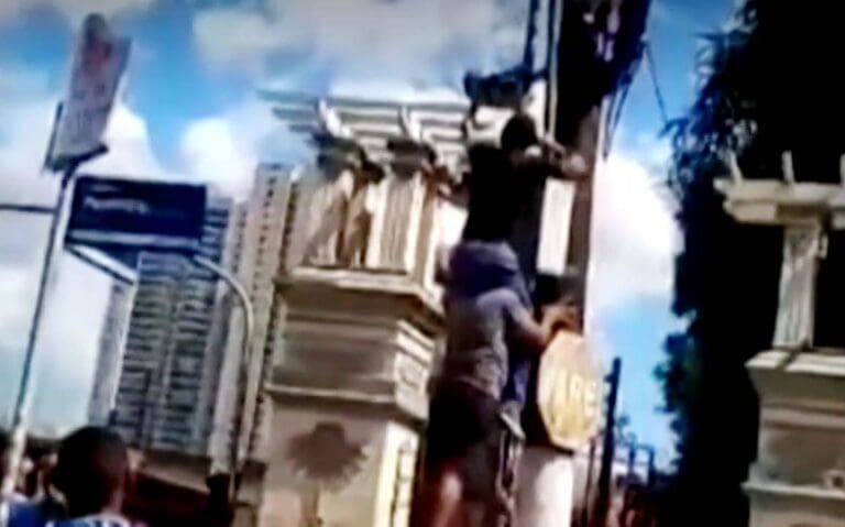 As imagens foram registradas na última quinta-feira (29), quando pedestres avistaram o bicho sobre a estrutura de energia. Apesar da ação arriscada, os homens que resgataram o animal não se feriram.