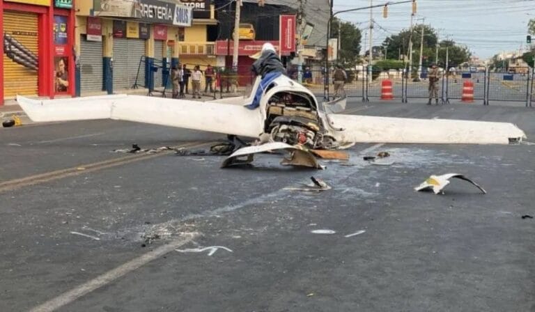 Um vídeo que circula pelas redes sociais exibe o momento em que uma aeronave cai em meio a uma via pública que possui um alto tráfego de veículos. O acidente ocorreu na última terça-feira (26) em Santa Helena, no Equador. Por meio das imagens é possível notar um grande movimento de carros e pedestres, inclusive, um motociclista cai devido ao impacto do acidente. (Assista ao flagrante abaixo)